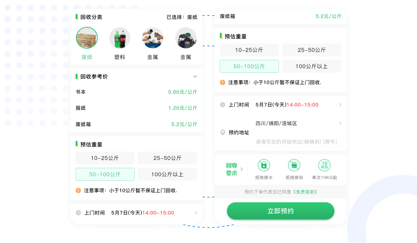 麥芒環?;厥战鉀Q方案:用戶通過小程序下單、系統自動分單、回收員上門回收、線上結算打款等幫助回收行業互聯網+,實現廢品回收數互聯網轉型,為環保事業做貢獻。